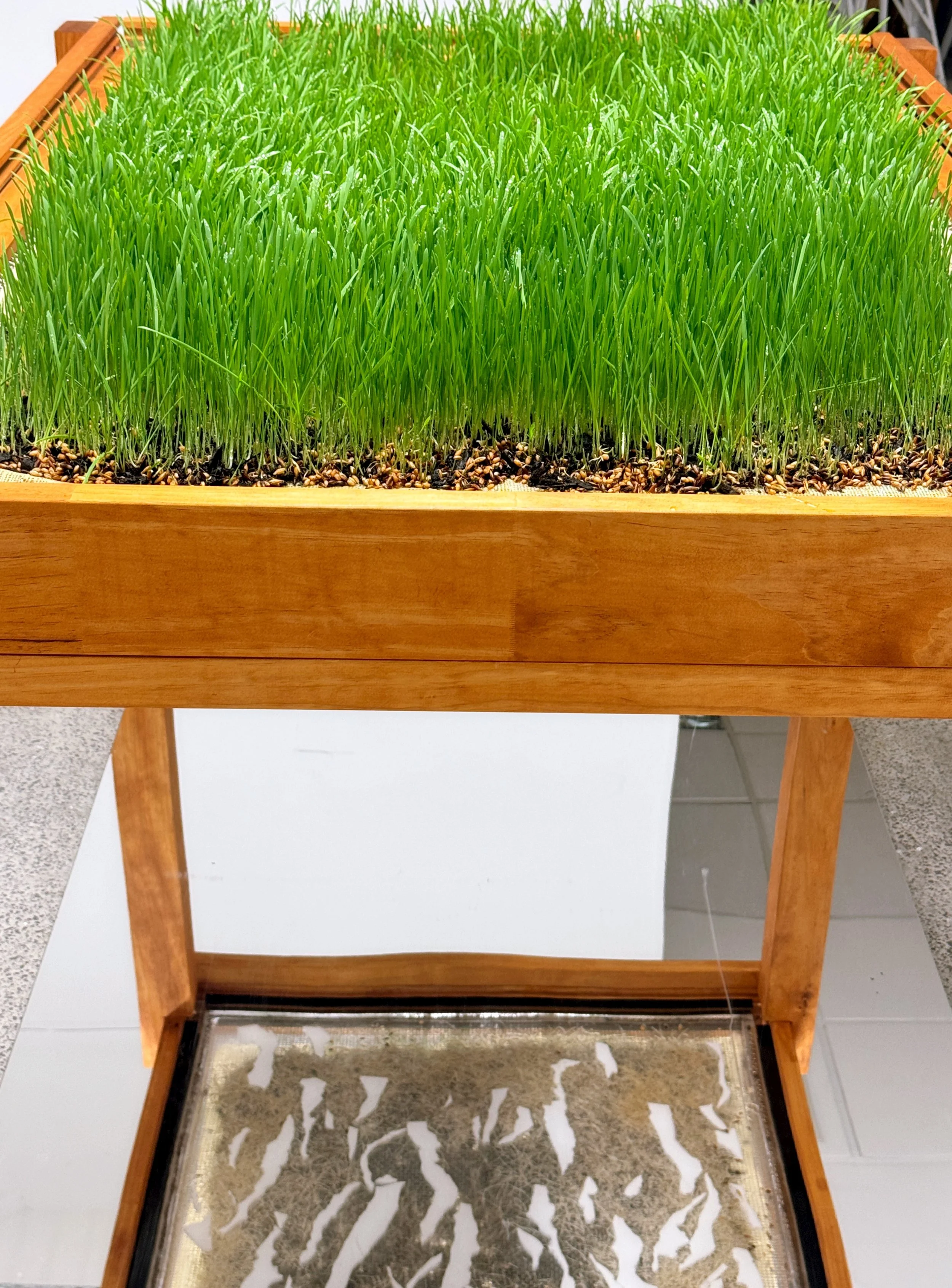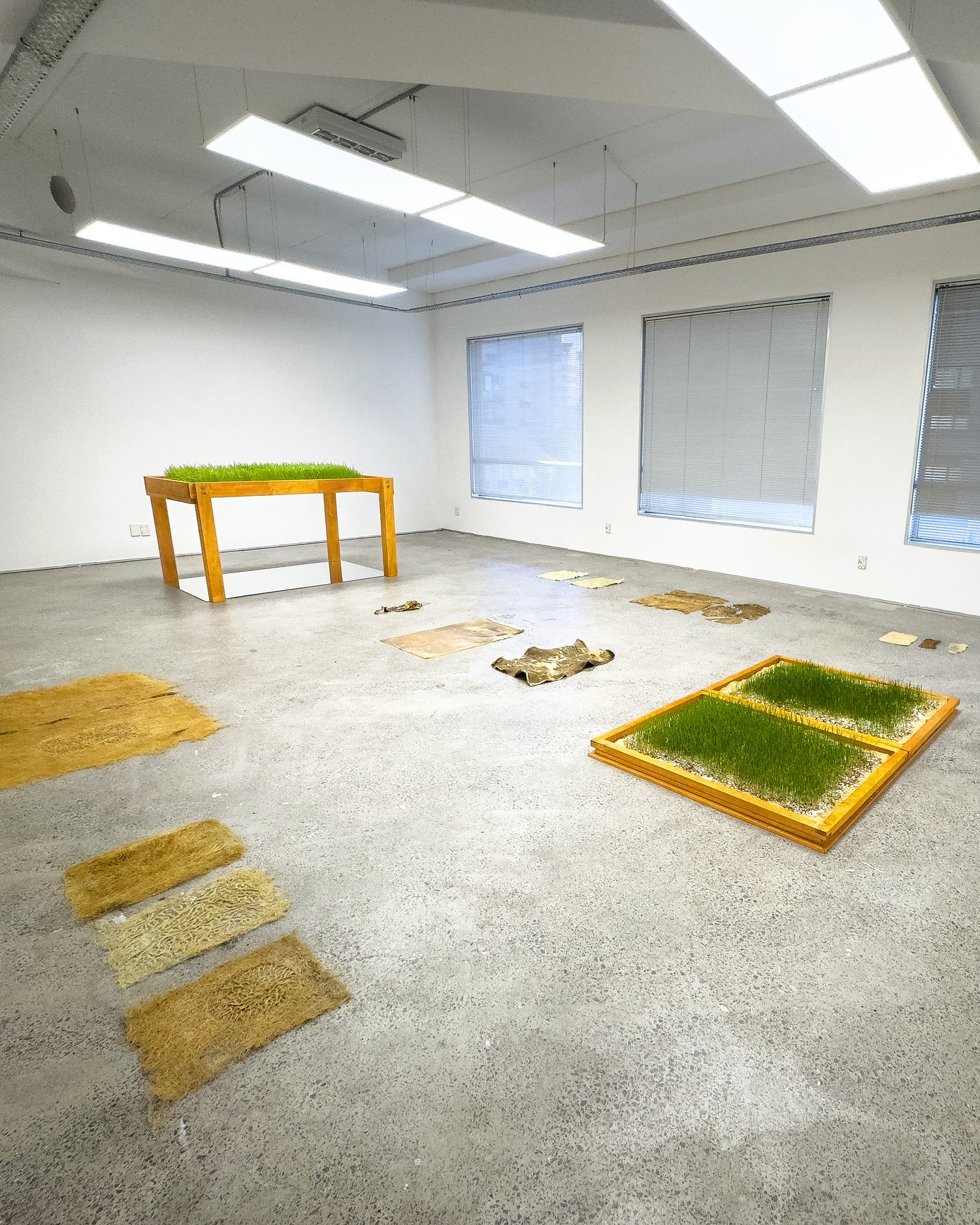 Materials: Oat and wheat grass root systems, oat and wheatgrass paper, wax, algae-based bioplastic, glass, bone, metal, soil, wood, paper