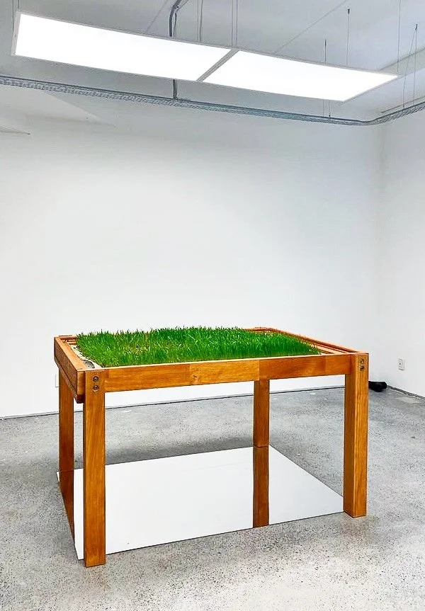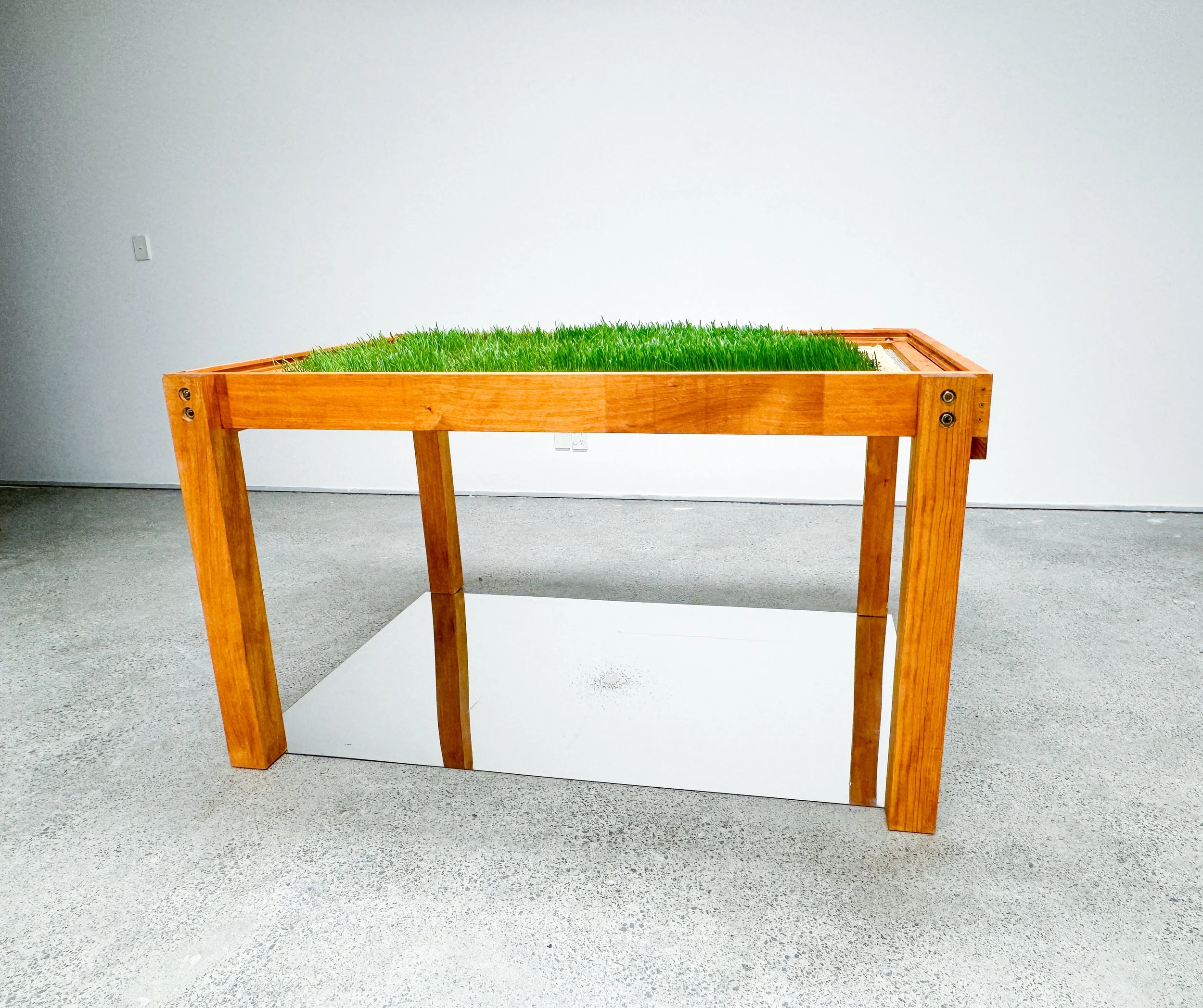 Materials: Oat and wheat grass root systems, oat and wheatgrass paper, wax, algae-based bioplastic, glass, bone, metal, soil, wood, paper