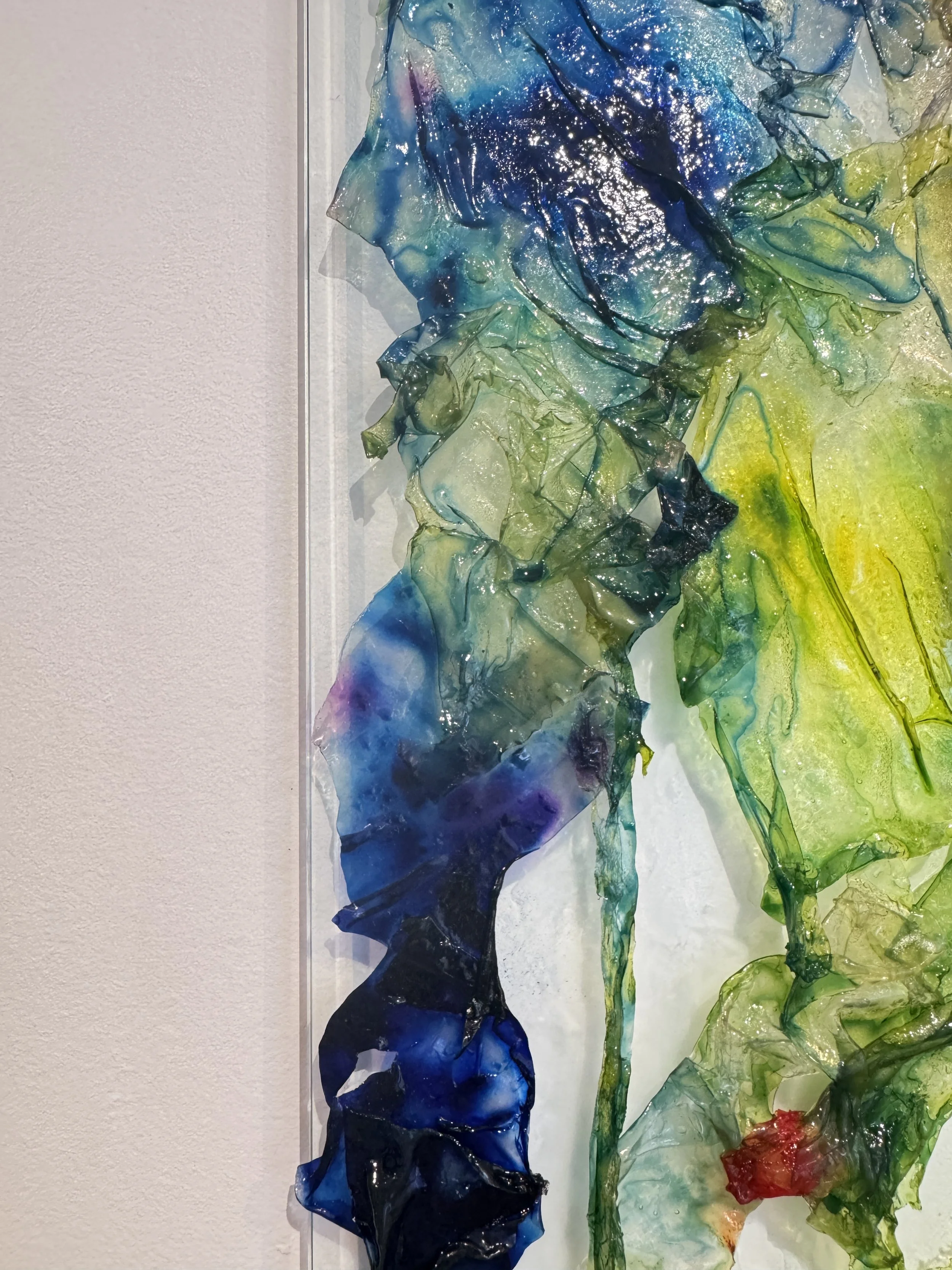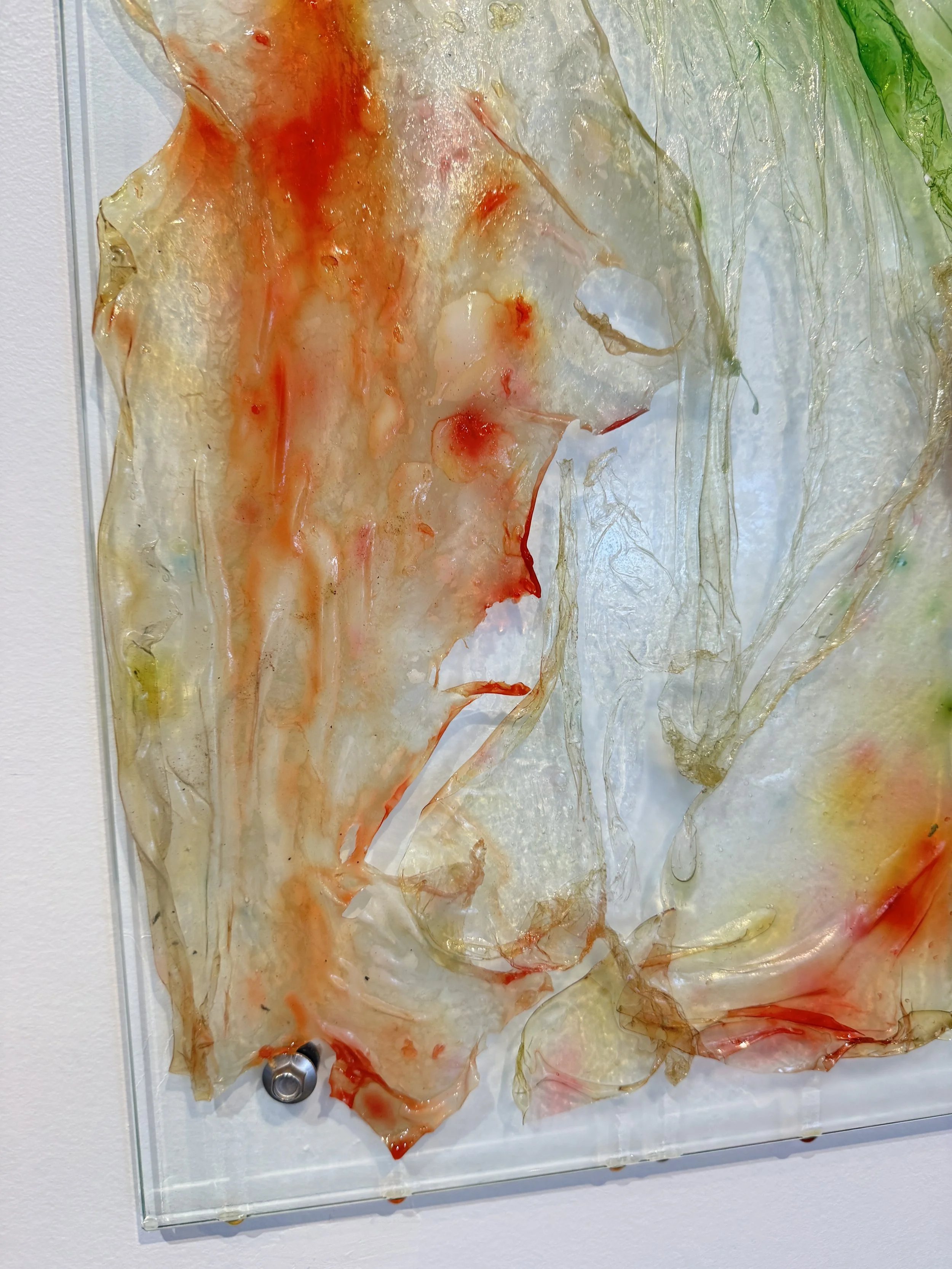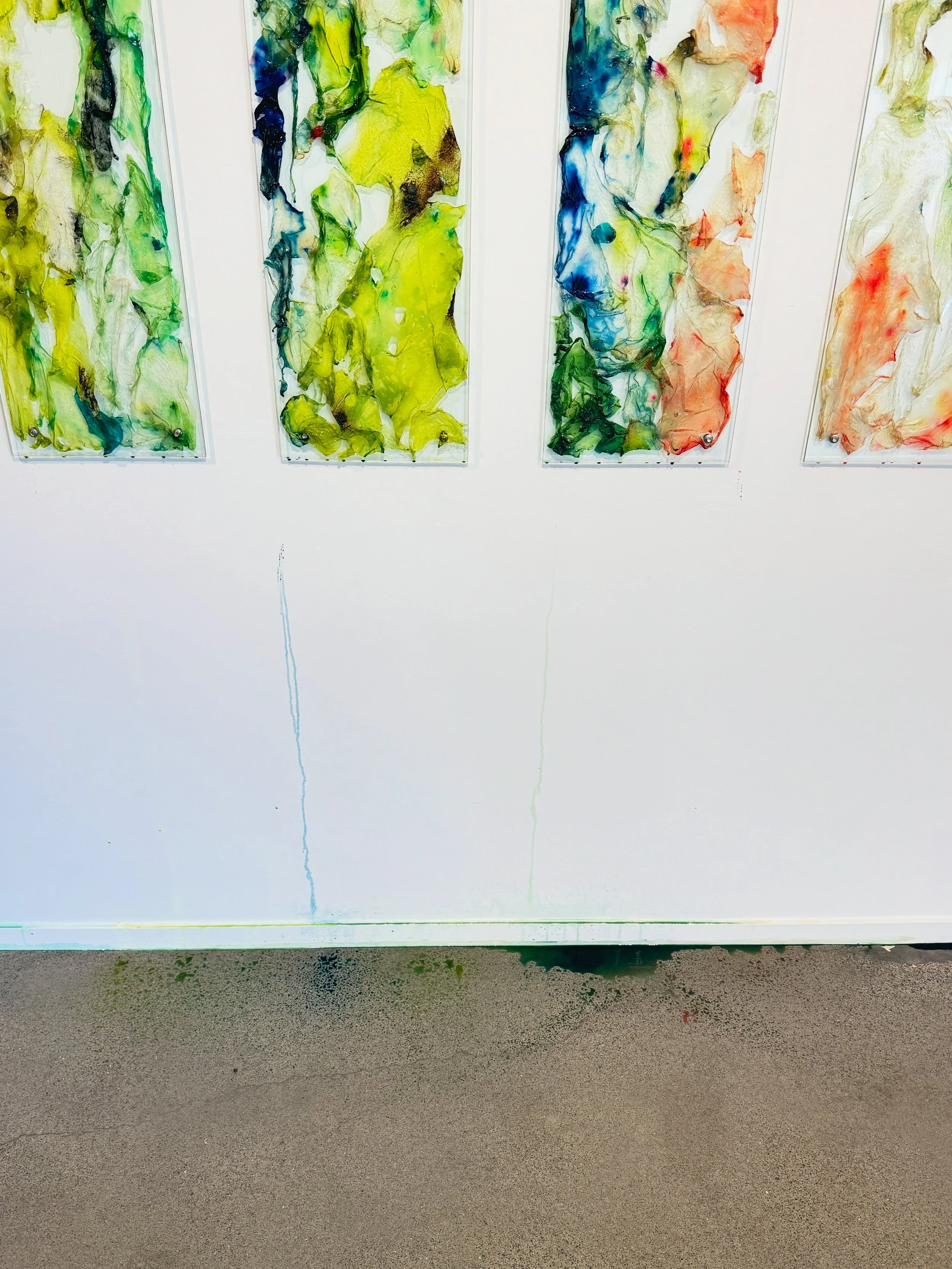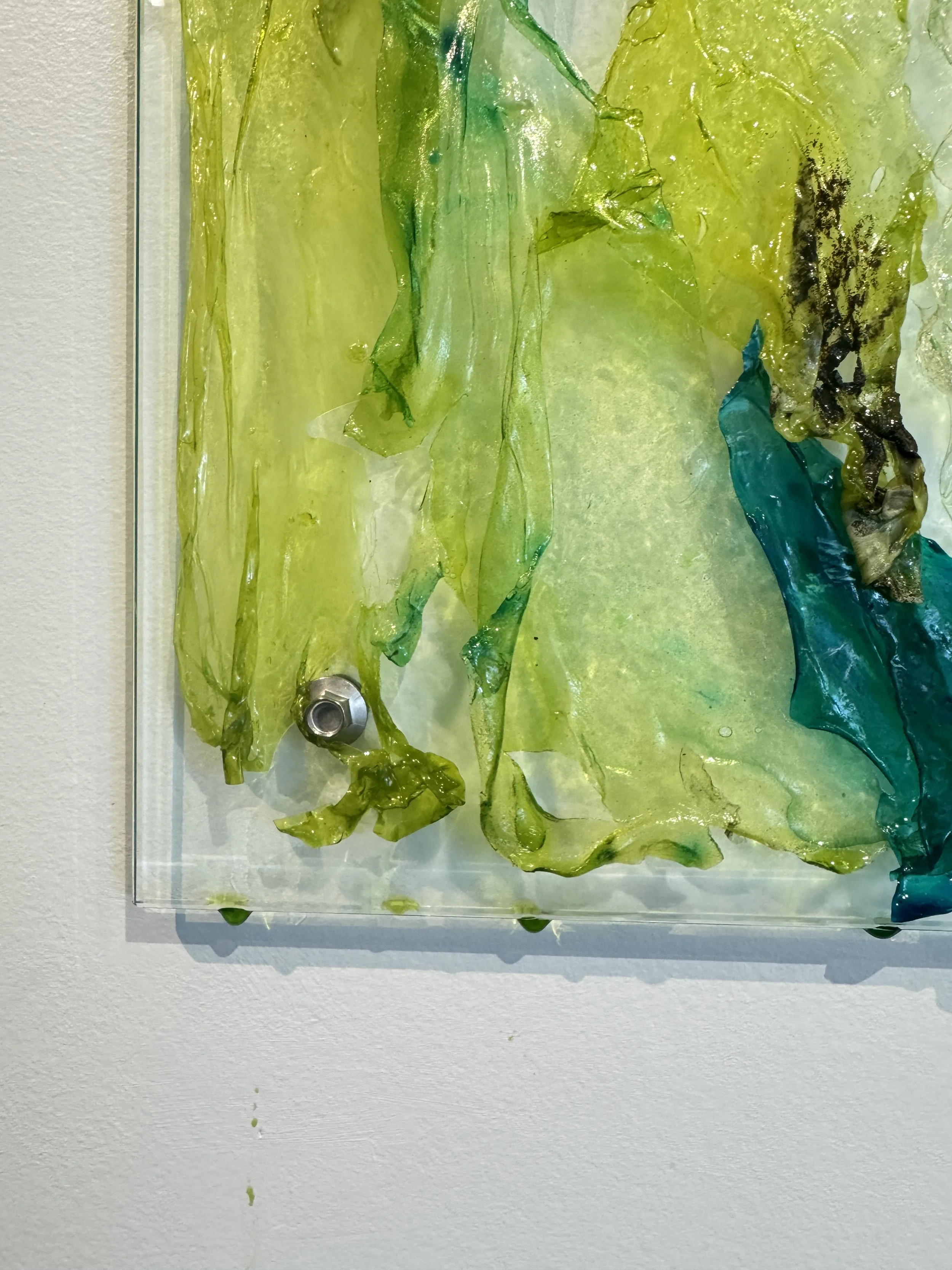 ‘Surrender' is a performatively ‘oozing’ installation of biopolymer on glass panes that explores potential, transience and the essence of embracing ambiguity. Derived from algae, one of the most ancient life-forms and considered fundamental to the start and maintenance of life on Earth, the biopolymer is a material that embodies evolution, potential, and transience. Life is filled with uncertainties; in surrendering to moments of ambiguity, the opportunity for growth and transformation can be discovered. 'Surrender' is about resilience, having faith in process, and discovering the potential (and the beauty) that can emerge from the unknown. It is an invitation to trust in the journey rather than fixating on the destination.